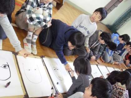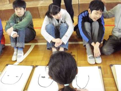 3月14日(木)、似顔絵集会がありました。たてわり班でお世話になった6年生の似顔絵を描いてプレゼントしました。4年生が顔の輪郭、2年生が目、1年生が鼻と口、仲よし学級が耳、3年生が髪の毛、5年生が仕上げを担当しました。