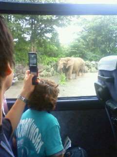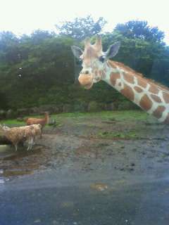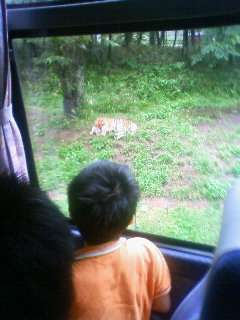 雨も小降です。富士サファリパークではバスに乗って見学です。シベリアトラやキリンに大喜び。昼頃には雨もやみました。