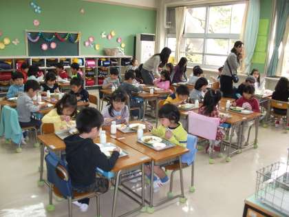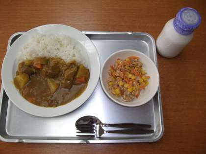 今日から1年生の給食が始まりました。子どもたちにも人気のある、世田谷小自慢の【カレーライス】です。1年生は担任の先生から「給食のおやくそく」を聞いてから“いただきます”をしました。とてもお行儀よく食べ、おかわりをする子も多く、食缶はすべて空っぽになりました。1年生に限らず、ご家庭で今日の給食について感想を聞いてみてください。