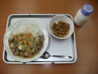 「中華丼、大豆とじゃこの甘辛揚げ、牛乳」です。