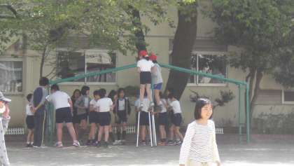 子供たちが毎日楽しみにしている休み時間。今の子供たちの遊びの様子を見ていると、ボールで遊んでいる子供、一輪車をする子供、竹馬をする子供、虫探しに精出す子供、図書室で本を読む子供…と様々です。狭い校庭を走り回っても互いに上手によけて走りまわっています。