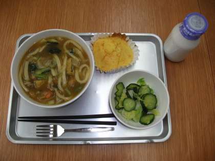 「カレーうどん、野菜の甘酢かけ、キャロットケーキ」です。