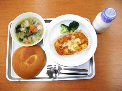「マーガリンパン、ポテトグラタン、ゆでブロッコリー、野菜スープ、牛乳」です。