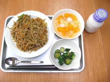 「ソース焼きそば、きゅうりの中華味、フルーツ白玉、牛乳」です。
