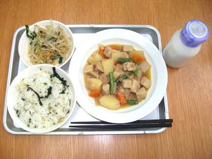 「青菜とじゃこのごはん、新じゃがのそぼろ煮、もやしのごま風味、牛乳」です。