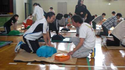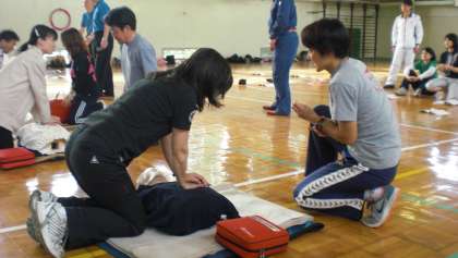 毎年、水泳学習が始まる前には必ずこういった講習を行っています。人工呼吸法、AEDの使い方、様々な年齢や症状を設定した訓練も。毎年受けていますが、1年たつと忘れていることも多く、毎年行う必要性を強く感じています。