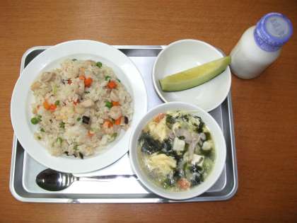 「チャーハン、卵とわかめのスープ、メロン、牛乳」です。