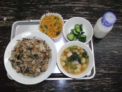 「豆入りひじきごはん、卵焼き、きゅうりのひと塩、豆腐汁、牛乳」です。
