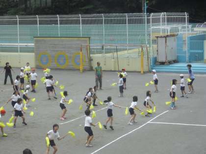 5,6年生の「組体操」、全校ダンスの「マイムマイム」の練習風景です。