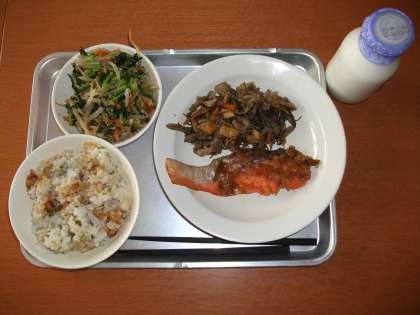 「豆ごはん、鮭の南蛮焼き、刻み昆布の五目煮、野菜のごまだれかけ、牛乳」です。