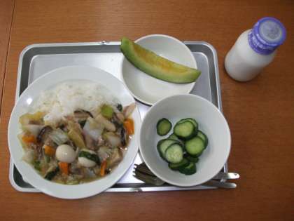 「中華丼、きゅうりの甘酢かけ、メロン、牛乳」です。
