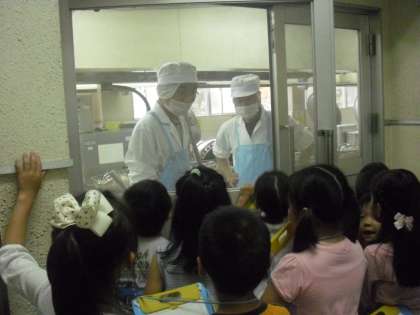 1年生が生活科の授業で学校探検をしました。給食室では、調理員さんたちから給食ができるまでのお話を聞きました。毎日食べているおいしい給食が、とても大きな鍋で作っているのを見て驚いていました。全校分の給食を、調理員さんが4人で作っていることにも驚きました。今日の給食も、楽しみになりました。