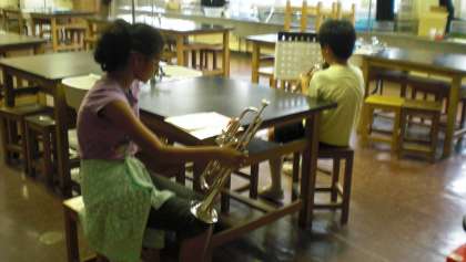三つ目は、音楽室で、リコーダーの練習や音楽クラブのこの金管楽器や木琴等の楽器の練習です。これも音楽専科教員がついています。