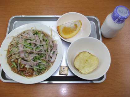 「冷やし中華、じゃが芋のバター焼き、甘夏みかん、牛乳」です。