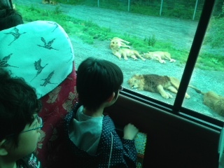 熊ゾーン、ライオンゾーン…とバスに乗ったまま、各ゾーン巡りが始まりました。歓声をあげながら観察して初めて知ったことなどを口々に言っていました。昨年も観た子供達でもまた新たな感激を表現していました。