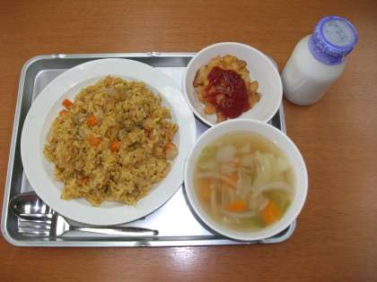 「カレーピラフ、キャベツスープ、大豆とコーンのフリッター、牛乳」です。