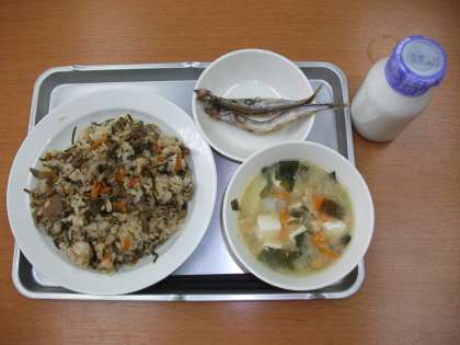 「豚肉とごぼうのごはん、みそ汁、焼きししゃも、牛乳」です。
