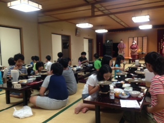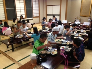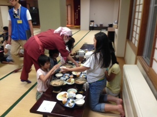 雨の中でも結構歩いたせいか、6時前には空腹を訴えていた子供たち。大広間に入ると、沢山の品数できれいに配膳されていたのを見て、大喜び。どの子もしっかり食べていました。