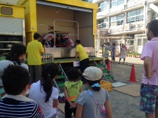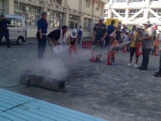 のべ200人以上の老若男女が集まり、グループに分かれて四つの訓練を行いました。起震車体験、通報訓練、救助法、水消火器訓練でした。