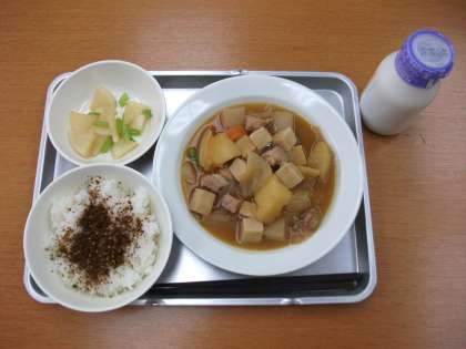 今日は、たっぷりのふりかけに、ごはんのすすむ和食のおかずの献立でした。6年生からは「ふりかけの味が少し濃かった」との意見も聞きましたので、今後は気をつけたいと思います。