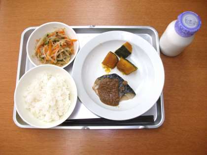 「ごはん、鯖のごまだれかけ、南瓜の含め煮、糸寒天と野菜の和え物、牛乳」です。