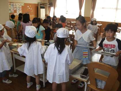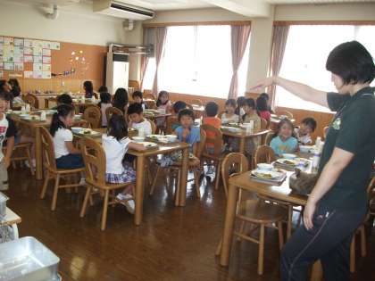 給食当番さんは、担任の先生に作ってもらった量のお手本を参考に、上手に配膳していました。おしゃべりも少なく、もめごともなく、てきぱきと準備を終えて、日直さんの号令で「いただきます」をしました。