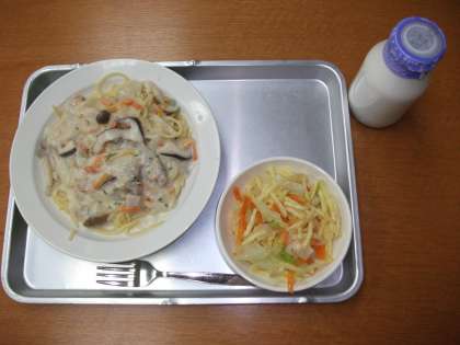 「スパゲティきのこソース、じゃが芋のハニーサラダ、牛乳」です。
