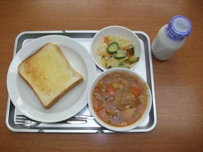 「ガーリックトースト、ビーンズシチュー、イタリアンサラダ、牛乳」です。