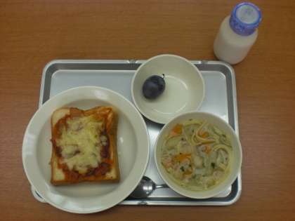 今日の給食は、ピザトースト・ヌードルスープ・プルーン・牛乳です。