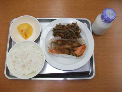 「ごはん、鮭のちゃんちゃん焼き、きんぴらごぼう、柿、牛乳」です。