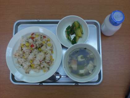 今日の給食は、ナシゴレン・わかめスープ・キュウリの中華味です。