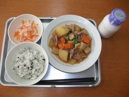 「わかめとじゃこのごはん、肉じゃがうま煮、大根の甘酢かけ、牛乳」です。
