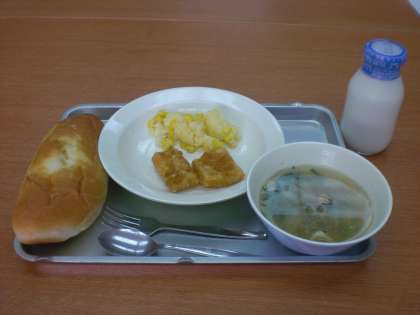 今日の給食は、ソフトフランスパン・いかのマリネソース・コーンポテト・野菜スープ・牛乳です。