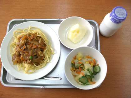 「スパゲティカレーソース、ポテト入りフレンチサラダ、りんご、牛乳」です。