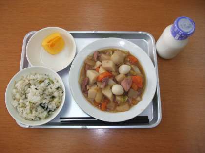 「青菜とじゃこのごはん、豚肉と大根の旨煮、柿、牛乳」です。