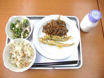 「豆ごはん、ししゃもの天ぷら、きんぴらごぼう、野菜のゆかりかけ、牛乳」です。