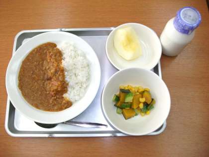 「キーマカレーライス、パンプキンサラダ、りんご、牛乳」です。