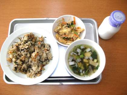 「磯おこわ、フーイリチー、すまし汁、牛乳」です。