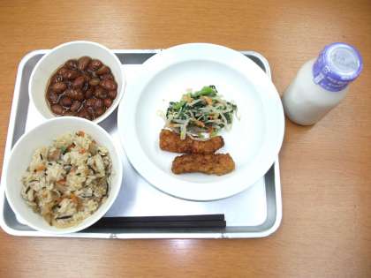 「五目ごはん、いかのかりんと揚げ、野菜のごまみそかけ、煮豆、牛乳」です。