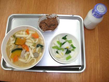 「ほうとう、かぶのゆずかけ、おからマフィン、牛乳」です。