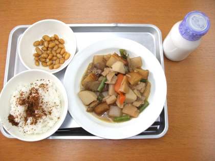 「ごはん、ふりかけ、炒り鶏煮、ぶどう豆、牛乳」です。