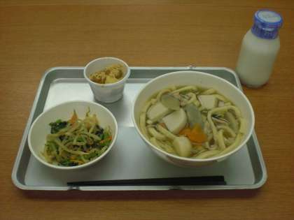 今日の給食は、けんちんうどん・月見だんご・野菜のごまだれかけ・牛乳です。