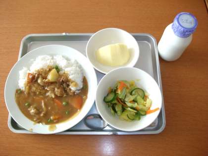 「カレーライス、野菜の甘酢かけ、りんご、牛乳」です。