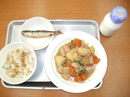 「豆ごはん、鰯の丸干し、筑前煮、牛乳」です。