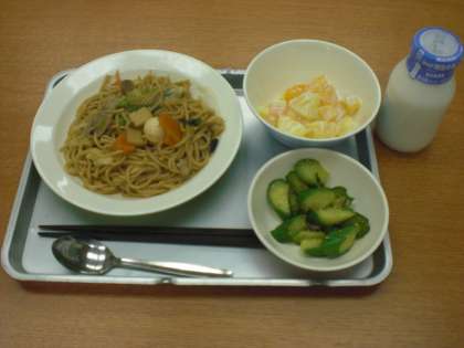 今日の給食は、五目焼きそば・野菜の中華味・フルーツヨーグルト・牛乳です。