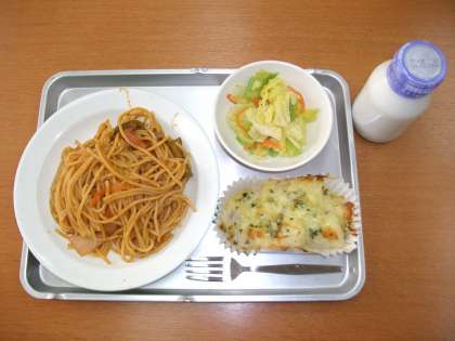「スパゲティナポリタン、ポテトクリーム焼き、キャベツサラダ、牛乳」です。