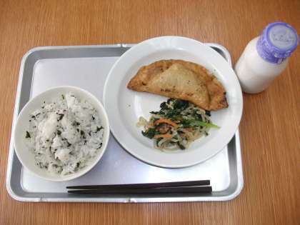 「わかめとじゃこのごはん、ジャンボ餃子、塩ナムル、牛乳」です。