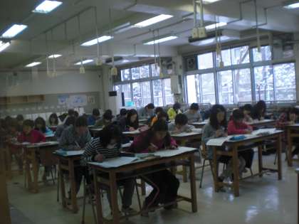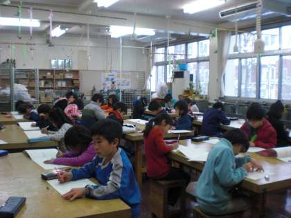 本日、雪が降り続く中でしたが、保護者の皆様のご協力により、無事に漢字検定を終了することができました。受検者74名中4名が残念ながら欠席となりましたが、70名が奮闘しました。最後まであきらめないで、制限時間いっぱいまで見直している子供や保護者の皆様がいて感心しました。どの子供も大変集中して受けていました。