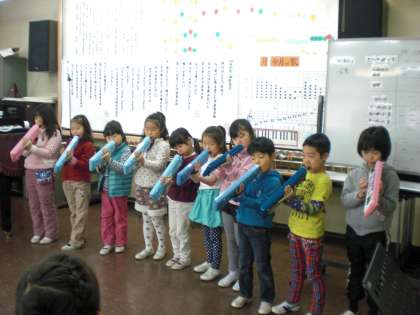 学校公開での1年生の音楽の時間。なんと1年生がみーんな短い吹き口をつけた鍵盤ハーモニカをそれはそれはみごとに演奏しているのです。曲目はなかなか難しい『ともだちになるために』でした。上手にできるようになった姿をお家の皆様に見ていただけて、どの子も得意そうに演奏していました。1年間の成長は大きいですね。