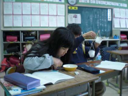 今日は4年生の算数では『重さ』の学習をしていました。gの単位を量感で理解する学習でした。天秤ばかりのような手製の秤を使い、1gである1円玉が何個分の重さを予想を立てて様々なものを計って確認していました。皆とても楽しそうで、計っている姿は、小さな博士のようでした。